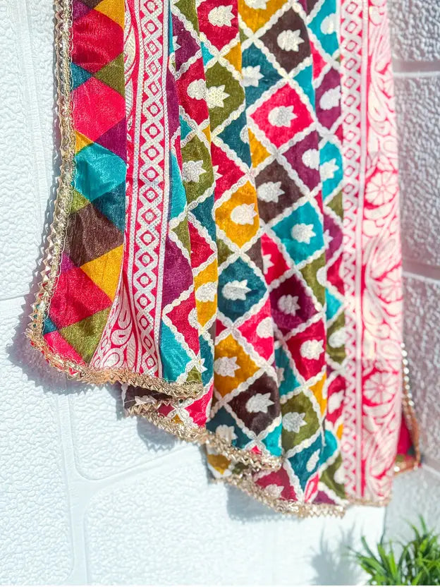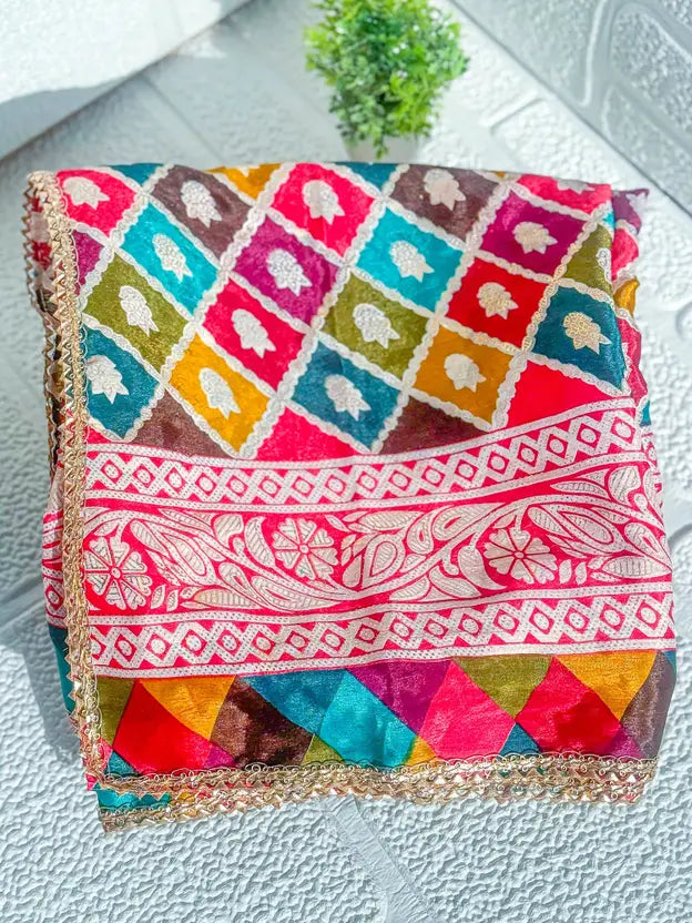 Add a splash of elegance and tradition to your wardrobe with this beautifully embroidered multicolor Art Silk Dupatta. Designed with vibrant geometric patterns and delicate golden lace on the borders, it’s the perfect accessory to uplift any ethnic outfit—whether for festive celebrations, weddings, or casual gatherings.