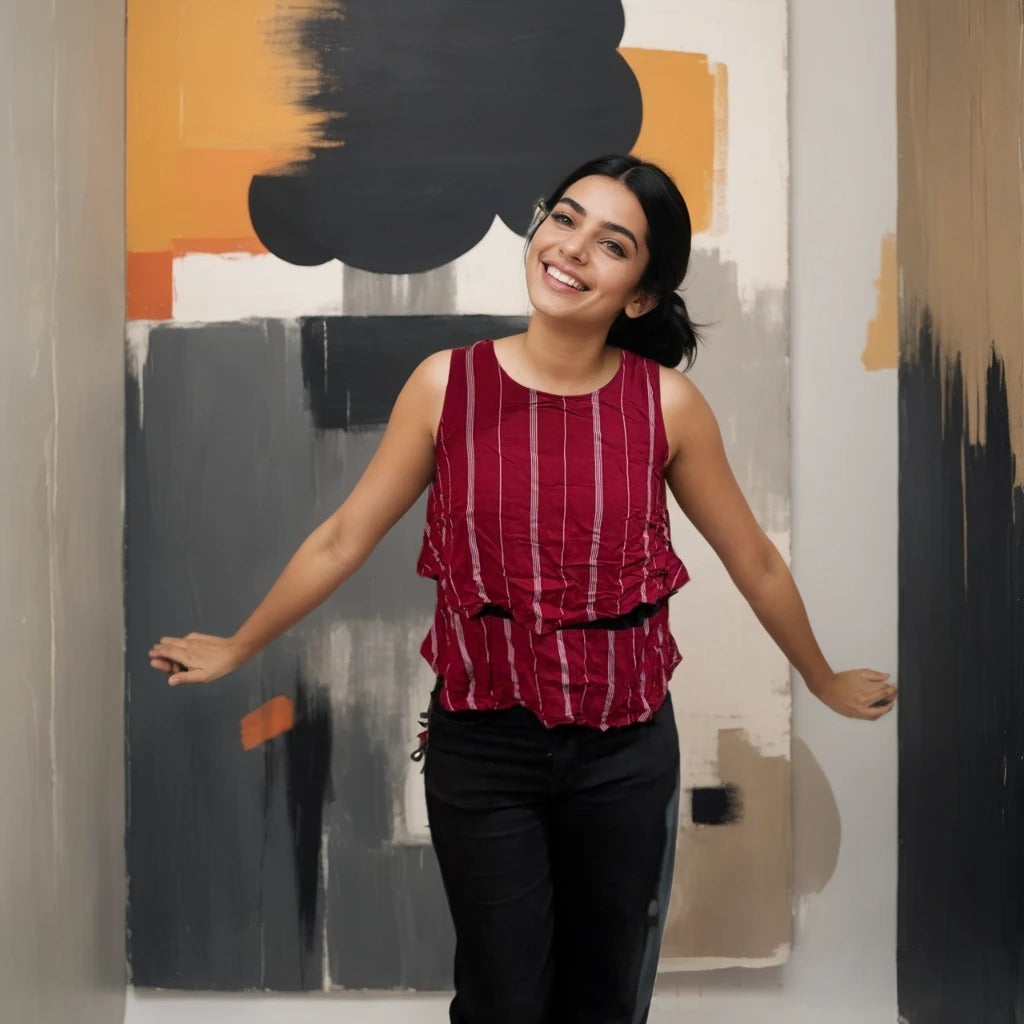This bold crimson-red top brings together smart vertical stripes with a playful ruched waist, creating a flattering silhouette that stands out without trying too hard. Designed to move with you and styled to stun, it’s the perfect piece to elevate your everyday.